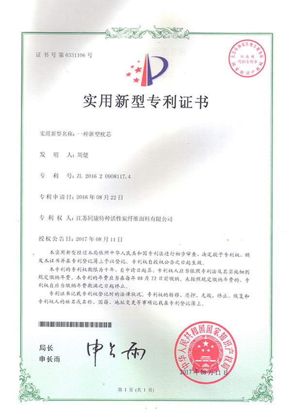 專利證書(shū)一種新型枕芯