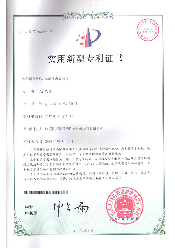 專(zhuān)利證書(shū)功能性內(nèi)衣面料