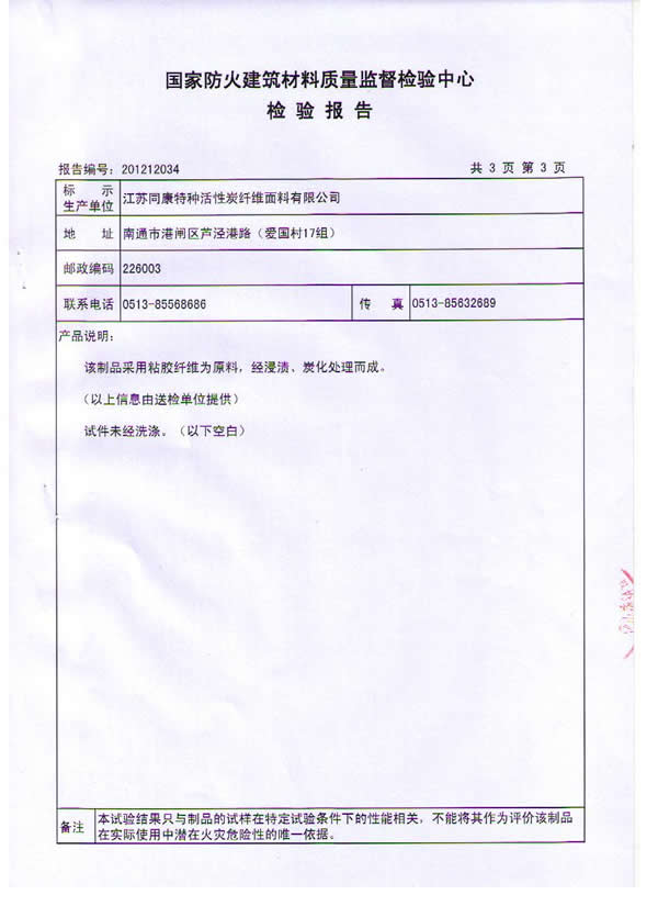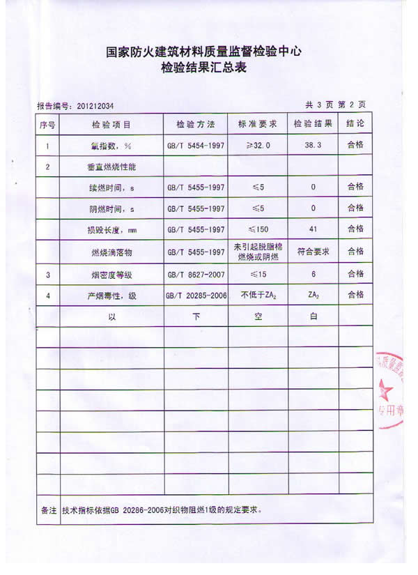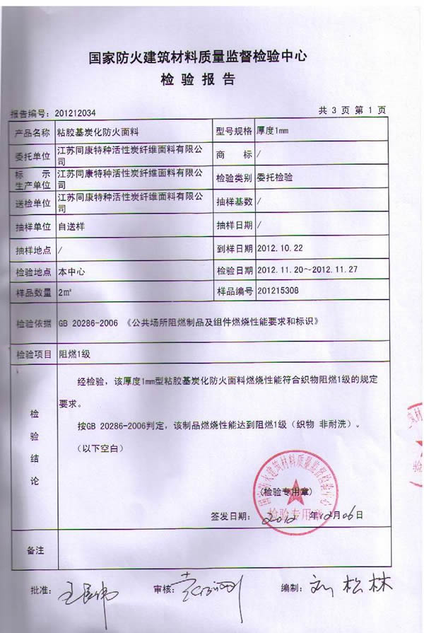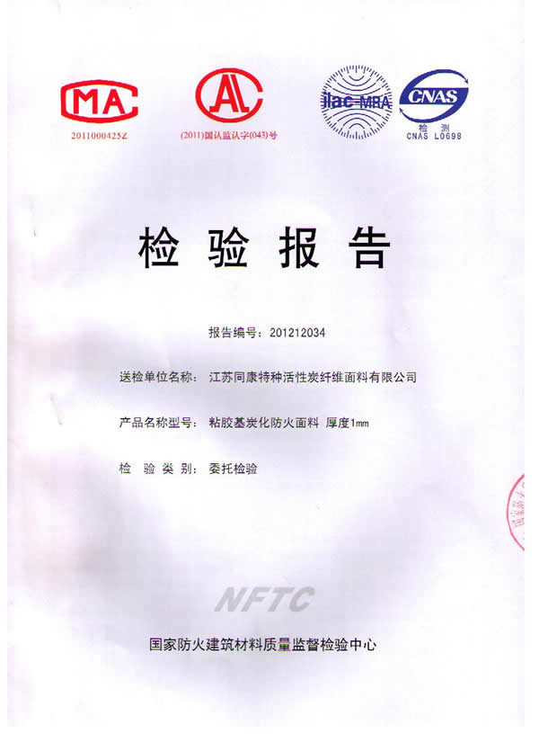 按國家標準GB 20286-2006《公共場所阻燃制品及組件燃燒性能要求和標識》判定,我公司研制的粘膠基炭化防火面料燃燒性能符合織物阻燃1級的規(guī)定要求,燃燒性能達到阻燃1級。該炭化防火面料由粘膠纖維織物為原料,經浸漬,炭化處理而成,具有耐高溫、耐明火,無陰燃,無續(xù)燃,無毒無害的特點,具有永久性阻燃功能。